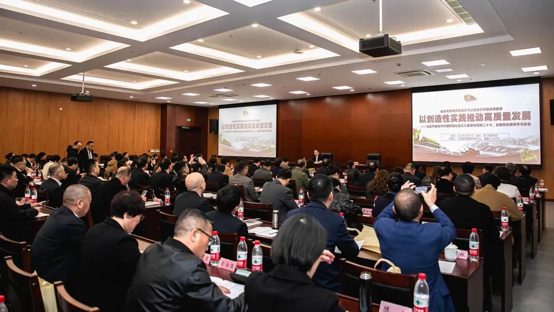 张天任董事长授课主题是《以创造性实践推动高质量发展》。他表示,习近平新时代中国特色社会主义思想、党的二十大、全国两会都贯穿着“高质量发展”这条主线。他结合浙江高质量发展的实践,AG庄闲高质量发展的历程,从十二个方面对“以创造性实践推动高质量发展”进行全面解读。